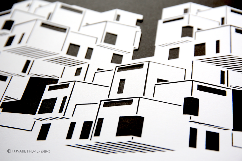 Un découpage 10x8 pouces d’Habitat 67, design original. Fait par découpeuse et fini à la main pour plus de précision sur papier cartonné blanc de 65 lb. L’envoi inclus aussi le fond noir en papier cartonné (qui n'est pas collé à l'oeuvre).