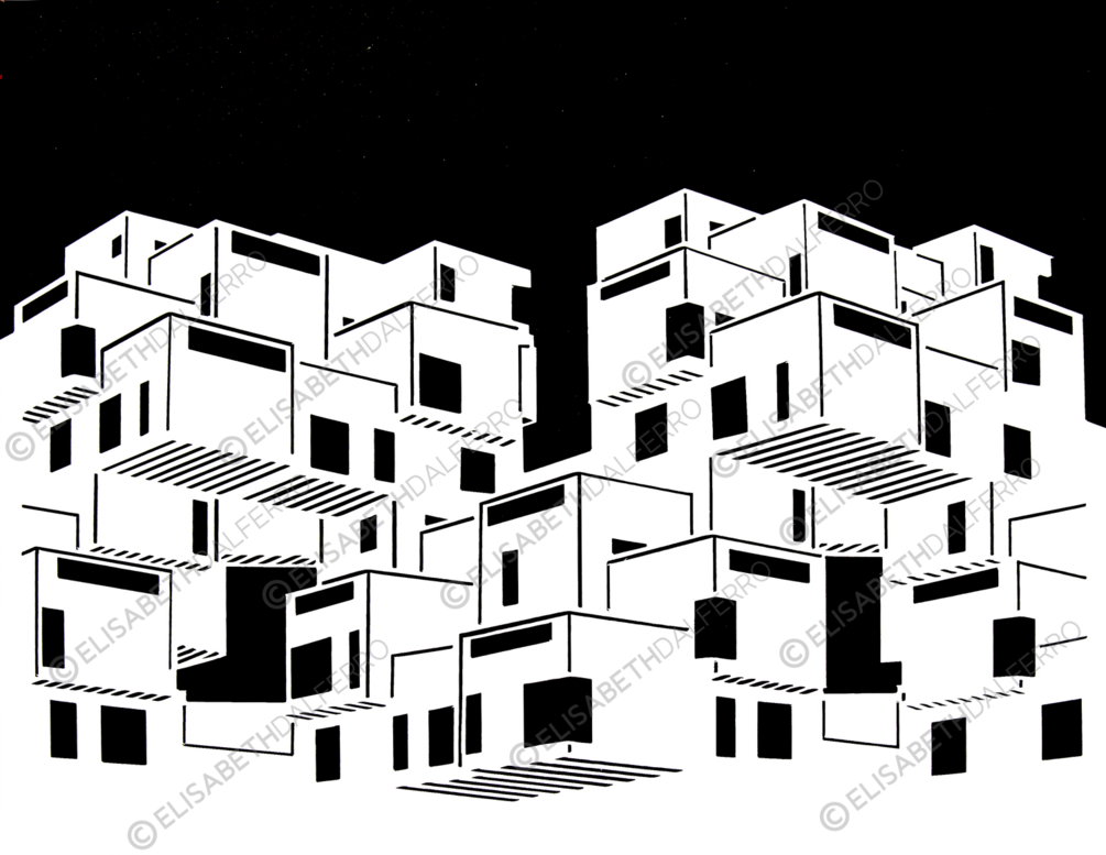 An original design, 10x8 inch cutout of Habitat 67. Made by die cutter and hand finished for more precision on 65 lb. white cardstock. The shipment also includes a black cardstock background (which is not glued to the artwork).